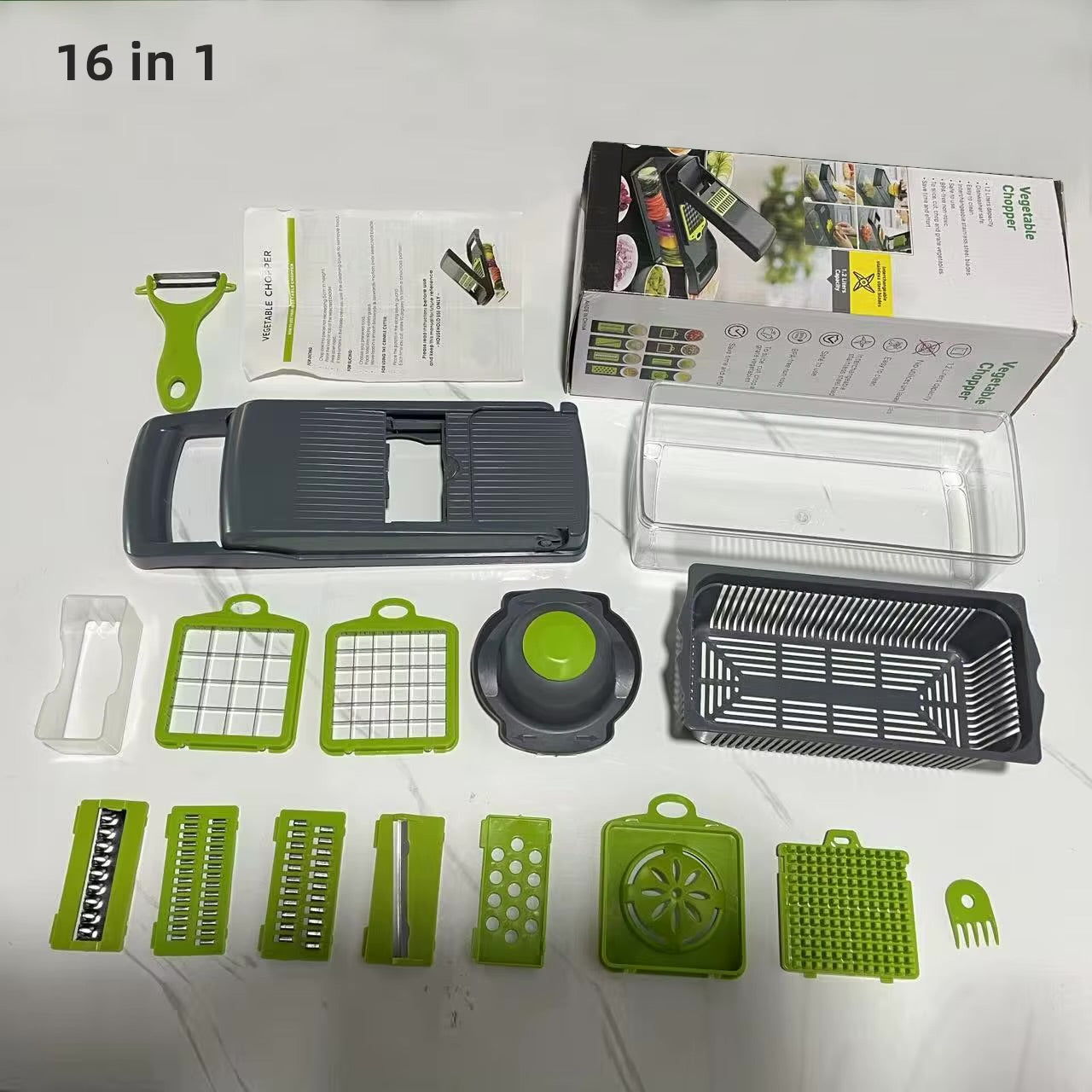 Avec le Coupe-Légumes 16-en-1, tu coupes tout en quelques secondes, sans stress, sans pleurer, sans te salir.